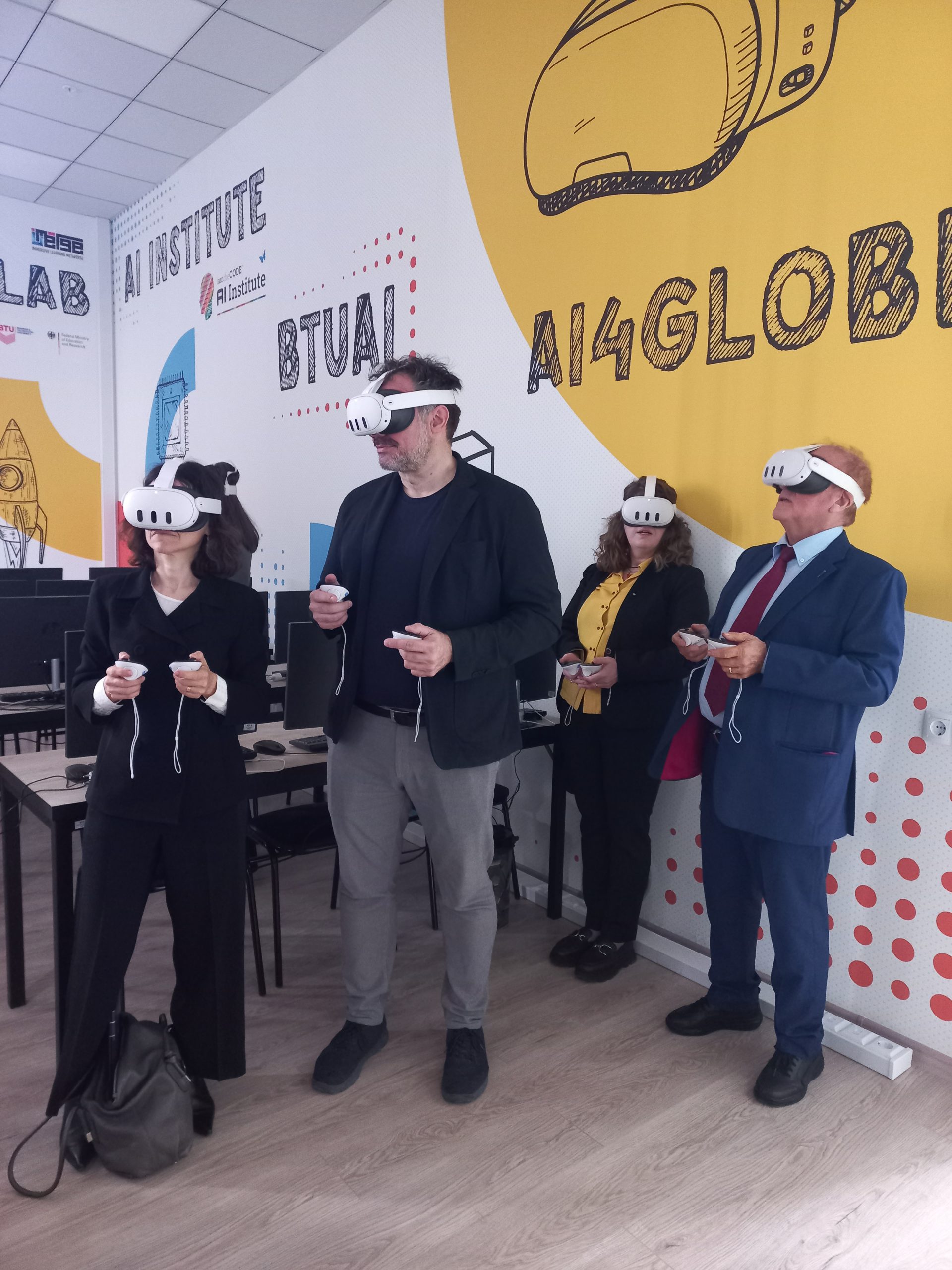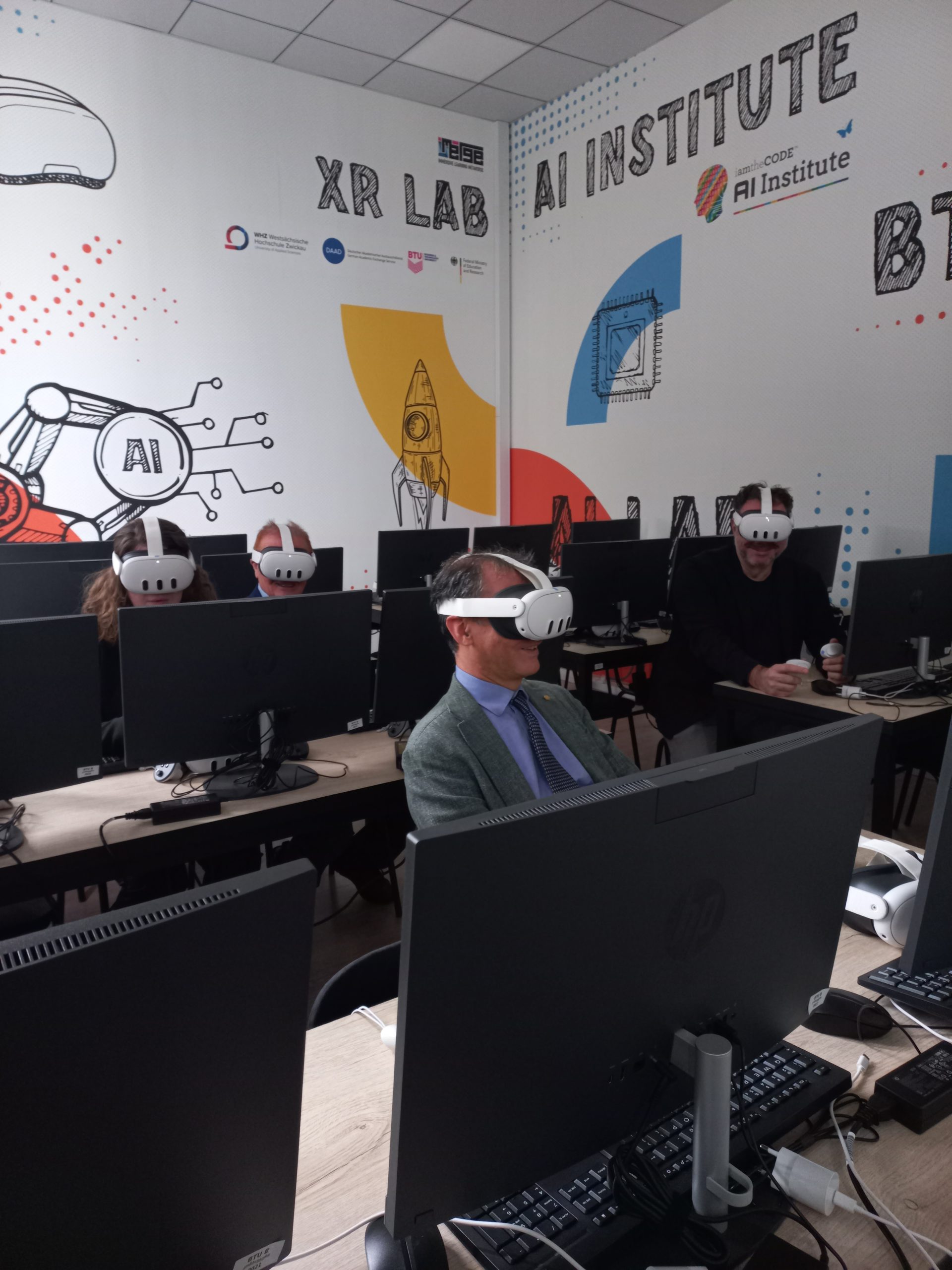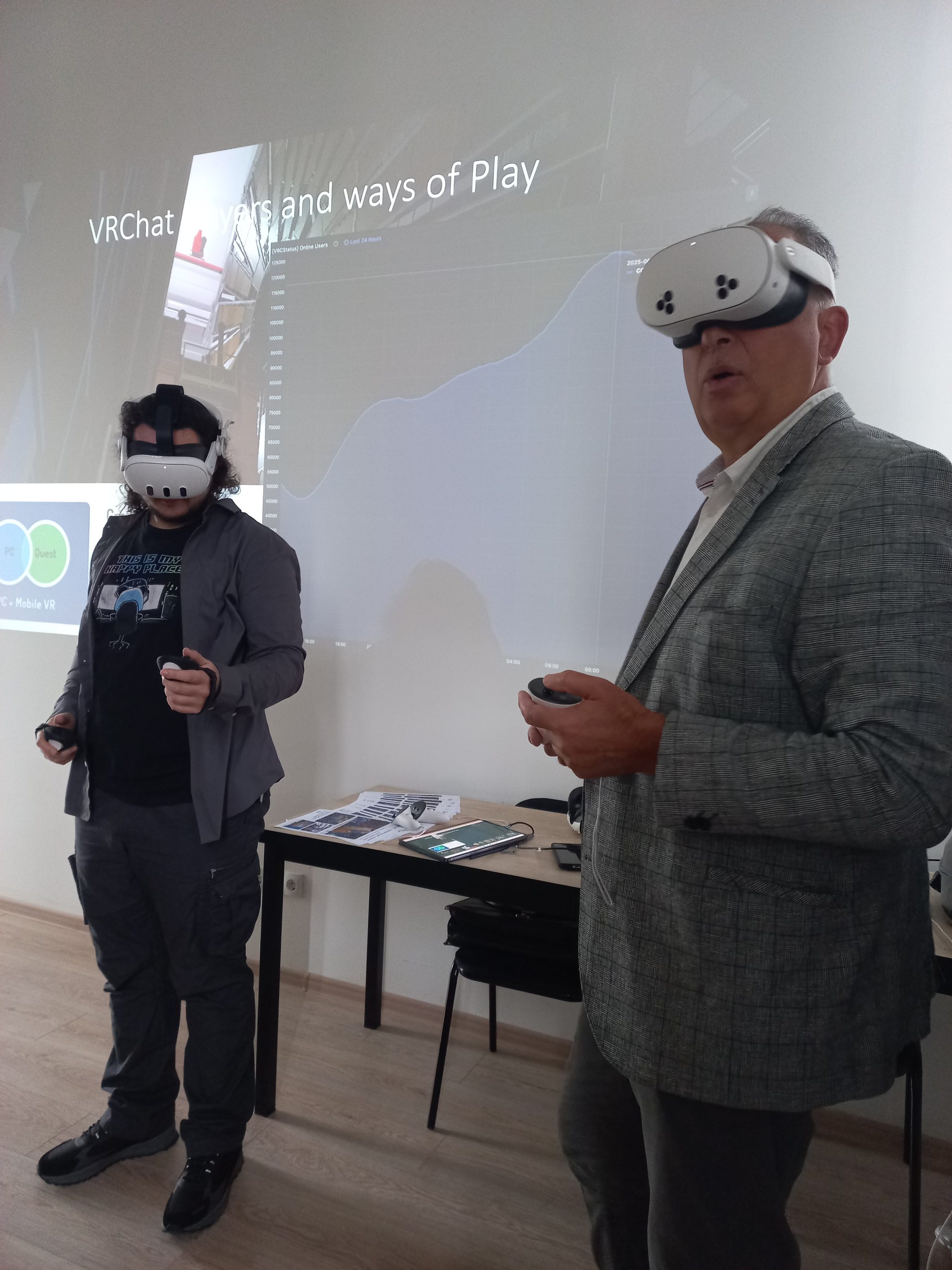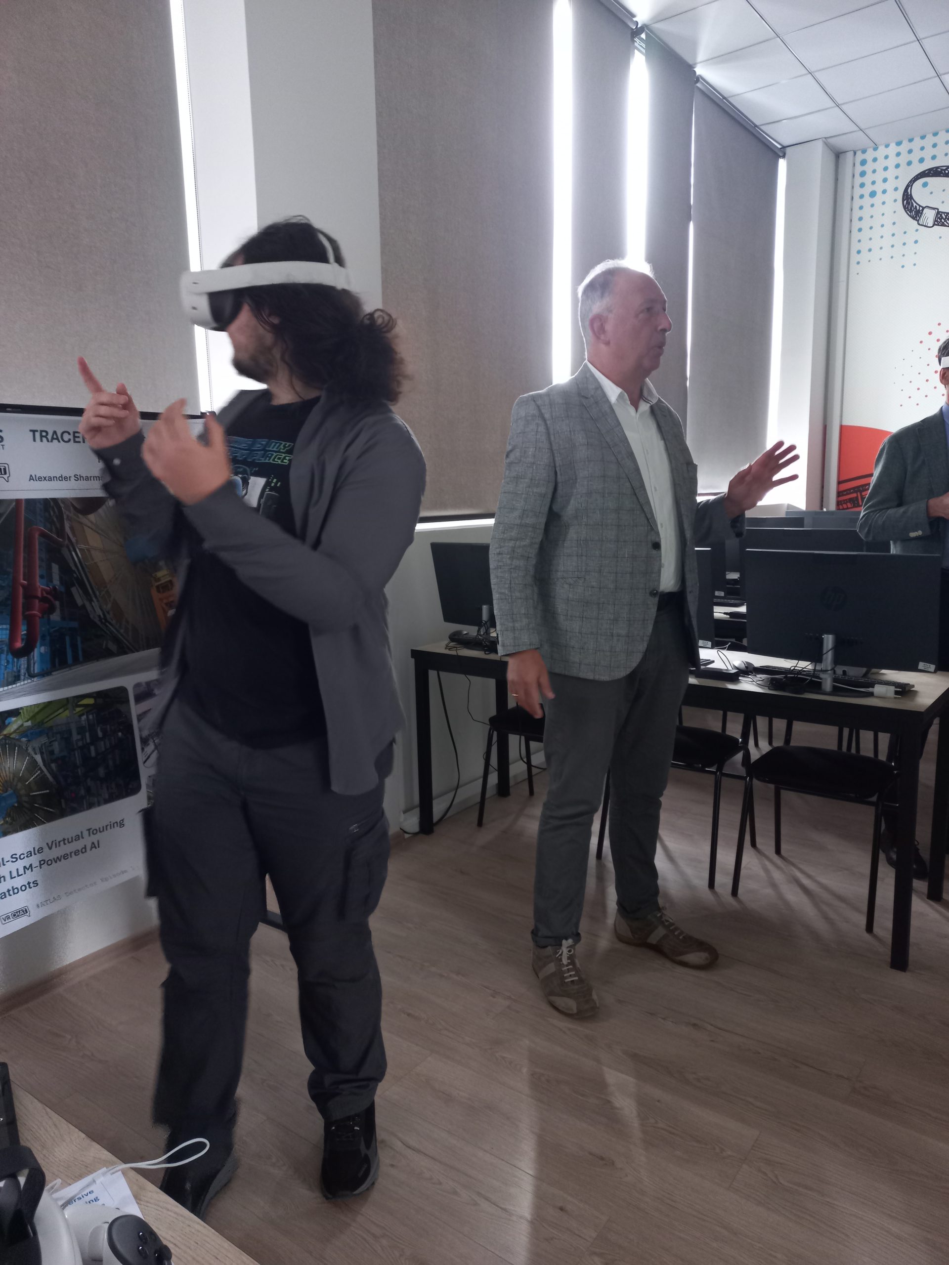 At BTU’s XR-Lab, Professor Alexander Sharmazanashvili and lead developer Giorgi Bokhochadze presented real-scale VRChat virtual reality platforms. The demonstration took place using Meta Quest 3 headsets and high-performance HP computers and sparked strong interest in future collaborative projects.